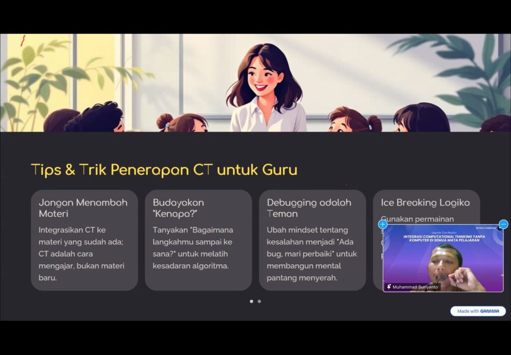 Webinar menghadirkan Muhammad Suriyanto, Guru IPA SMPN 2 Salapian, Fasilitator Koding KA Kemendikdasmen, Gemini Certified Educator, sekaligus Official Trainer HTTID, sebagai narasumber utama. Dalam pemaparannya, disampaikan bahwa di tengah masifnya perkembangan AI, pembelajaran tidak cukup hanya mengajarkan cara menggunakan teknologi, melainkan harus menanamkan cara berpikir komputasional (Computational Thinking/CT) agar peserta didik mampu menjadi pengendali teknologi di masa depan.