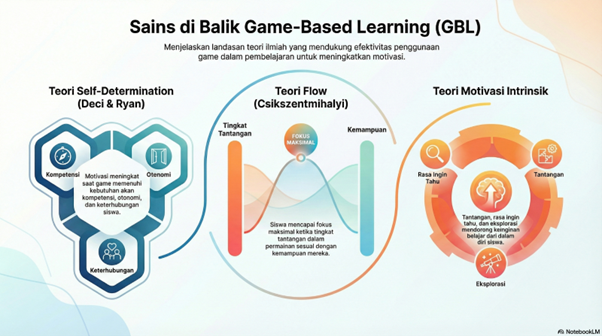 Teori Self-Determination (Deci & Ryan): Motivasi meningkat ketika kebutuhan akan kompetensi, otonomi, dan keterhubungan terpenuhi. Game menyediakan ketiga aspek ini.